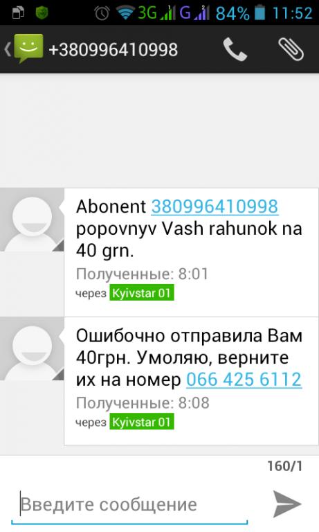 По поводу возврата денег на телефон - я однажды действительно по ошибке перевела 20 гривень не на свой номер, а на номер чужого человека, т.к. в терминале ввела лишнюю цифру и заметила это уже тогда, когда нажала кнопку "Оплатить".