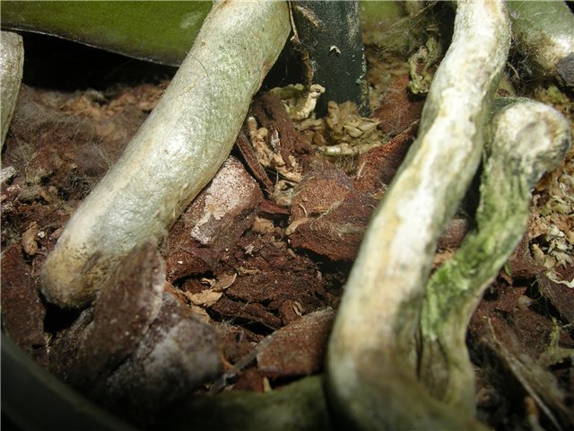 кто знает : у меня в горшке на орхе моей как пайтинка есть...на коре то есть..так и надо?я слышала что ее поливать нужно когда корни белыми станут..а они что-то слишком долго зелеными остаются..так нужно?