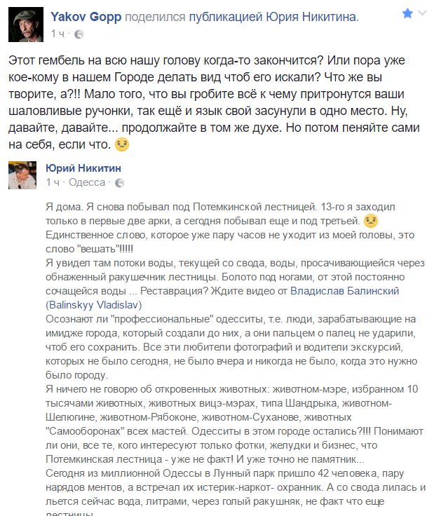 Я еще когда писал, что поворовали себе на дачи аутентичный камень с Тираспольской, заменили его на корявый житомирский новодел, а с Потемкинской лестницы делают порнографию, в частности заслуженный директор Экостроя и наш незабвенный придворный архитектор, порадовавший горожан галюцигенной Аркадией и пора еще не оформившимися очередными идиотскими новостроями. До чего же надо не любить город....