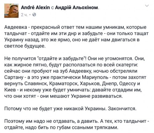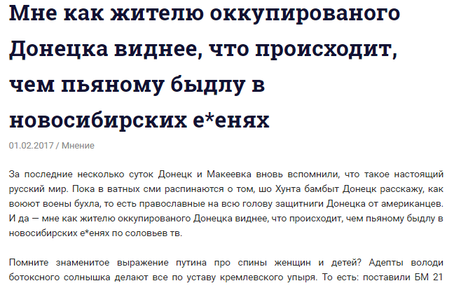 В перекладі с днр-івської на українську: "Лупили по украм та за жопорукістю //ашили лінію, що до нас підходила. Тепер сидимо у пітьмах в своїй Горлівці, шнайпери довбані. А зранку підемо клянчити Правий сектор (заборонено у росії ТМ) щоб поробив нам світло "бо діти мерзнуть"