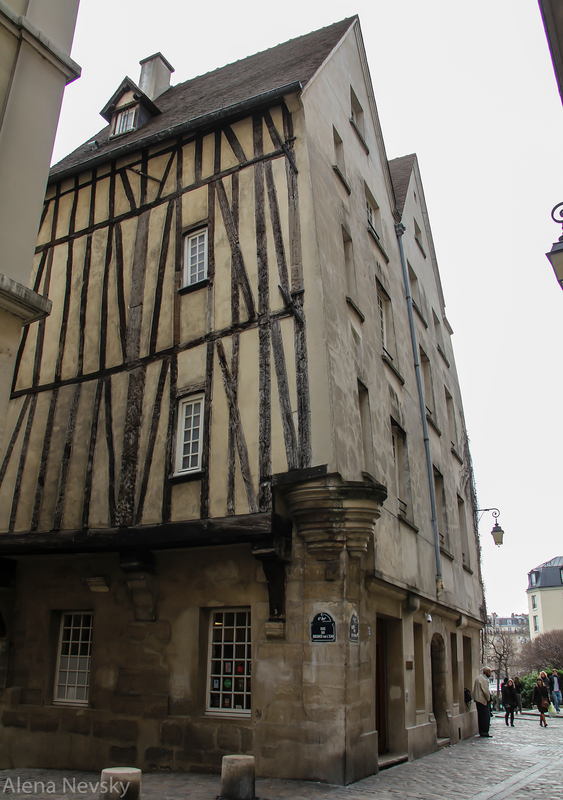 Типичный частный средневековый дом строился примерно так: первый этаж каменный, там лавка или мастерская - рабочее место. Далее «этаж», а то и два (потому «первый» этаж, как обозначают французы, это, на русский взгляд - второй) (кстати, есть о чём задуматься)... Этажи строились по технике «maison à colombages». «Дом фахверковой конструкции». «Каркасная конструкция». То есть каркас дома состоит из наклонённых под различными углами деревянных балок, пространство между которыми заполняют чем придётся: кирпичами, извёсткой, глиной, глино-соломой, деревом… Такие дома великолепно горят! Особенно, когда стоят впритык друг к другому со всеми своими деревянными балками напоказ. Красиво, конечно. Но в 1607 году всех домовладельцев заставляют покрыть дома штукатуркой, дабы никакого дерева видно не было. Не из эстетических соображений – из соображений пожарной безопасности. «Colombages» (фахверк) (вот ведь слово!) (немецкое, ессно), видимый сегодня на фасадах средневековья – это уже результат современной реставрации. Или новодел.