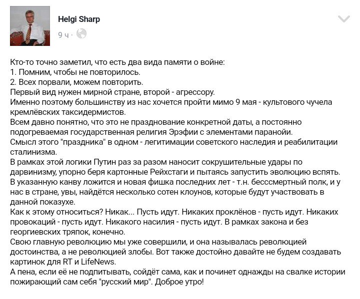 9е Мая - день Памяти, Скорби и Благодарности, низкий поклон всем тем, кто участвовал, кто погиб в той жуткой войне с фашизмом и нацизмом - русским, англичанам, полякам, евреям, беларусам, казахам, грузинам, армянам, татарам, американцам, австралийцам и многим другим... Христианам, буддистам, мусульманам, иудеям - всем, кто поборол Зло. И я считаю, что особым образом сейчас, в наше постыдное для России время, мы должны поклониться братьям-украинцам, ведь каждая пятая жизнь, отданная в борьбе с фашизмом - украинская. И мне, как гражданину России, бесконечно стыдно за то, что сейчас творит засевшее в кремле преступное российское правительство с теми, чьи предки бок о бок с нашими предками, в одном окопе, в одном танке, на одном поле боя отдавали свои жизни в схватке с общим Злом.