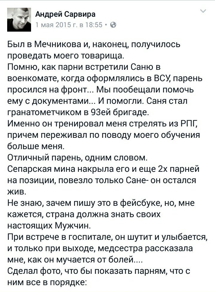 Не могу спокойно смотреть на это фото, а что говорить о его родных и близких? Этого раненного надо показывать тем, кто еще верит кацапам и говорит, что мы по прежнему братья. Желаю нашему герою быстрого выздоровления, а Путину скорее сдохнуть.