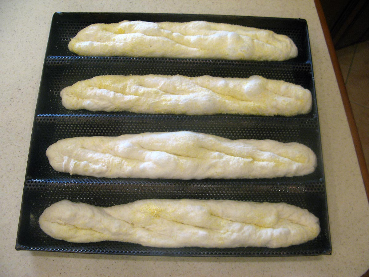 Смесь семолины и кукурузной муки - для посыпки. хорошо обваливаю багетную заготовку в этом, периодически увлажняя.