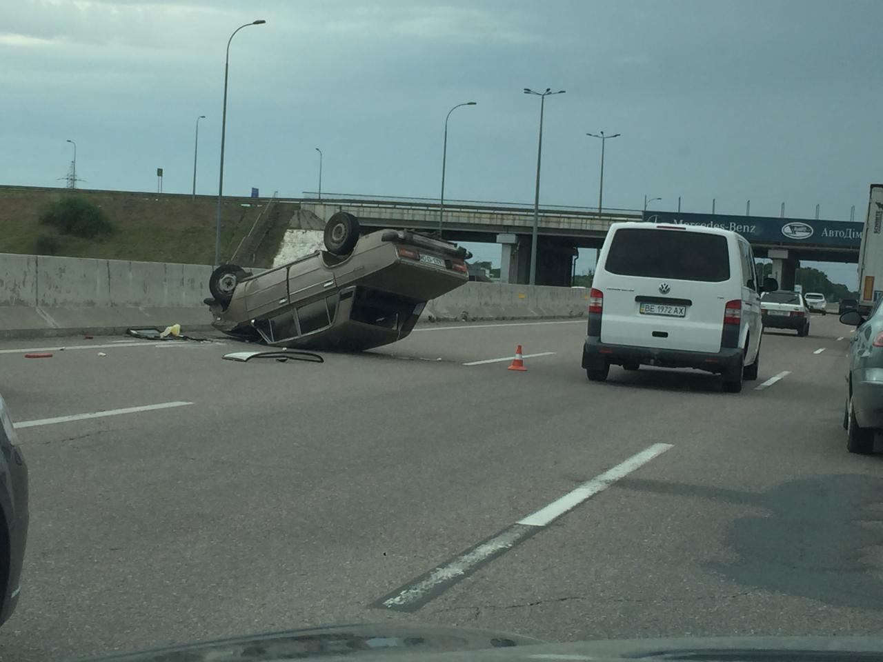Перед клеверным мостом в сторону Киева Ваз 2106 на крыше. А под мостом фура на аварийках стоит, может второй участник Дтп ?