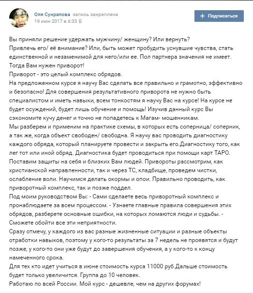 Думаете, не нашлось дурочек, которые считают, что за 11 тыс. рэ они отхватят не только дар и силу колдовскую, но и любого мужчину сумеют удержать = сломать волю?..