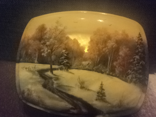 - лаковая миниатюра с рисунком (типа Палех, Федоскино).
