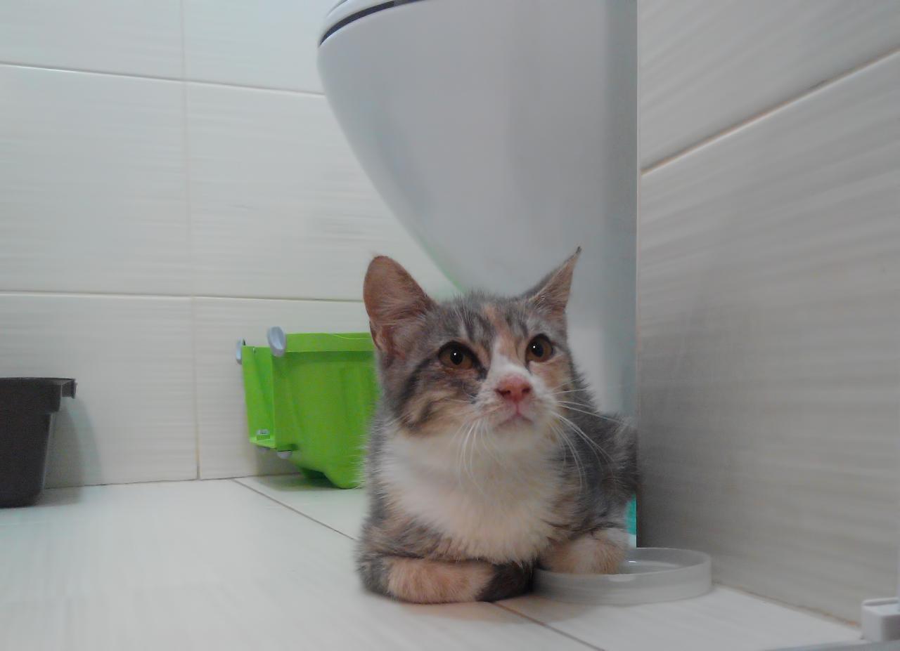 Этого симпатичного уличного котенка (девочка, месяцев 6-7) я не дал растерзать собакам. У животного была травма головы. Она не так хорошо как здоровые ориентируется в пространстве,немного "подтормаживает". Но хорошо ест, ходит только на лоток, гуляет (во дворе, под присмотром), мурчит, тянет лапки, просится на руки)) Ругается, когда ей что-то запрещаешь. Очень любопытная симпатяга.