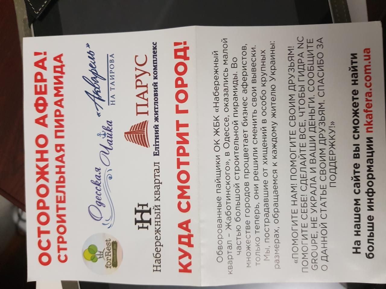 Жк одесская чайка на Сахарова, на Плиева, жк форрест и наша стройка имеет общего хозяина. По документам! Но разница лишь в том, что нашу стройку кинули, кинули более 300 семей. А остальные стройки еле-еле ведут и далее собирают деньги с наивных людей. Вот и думайте, стоит ли вкладывать в эту пирамиду деньги! Читайте подробнее на nkafera.com.ua