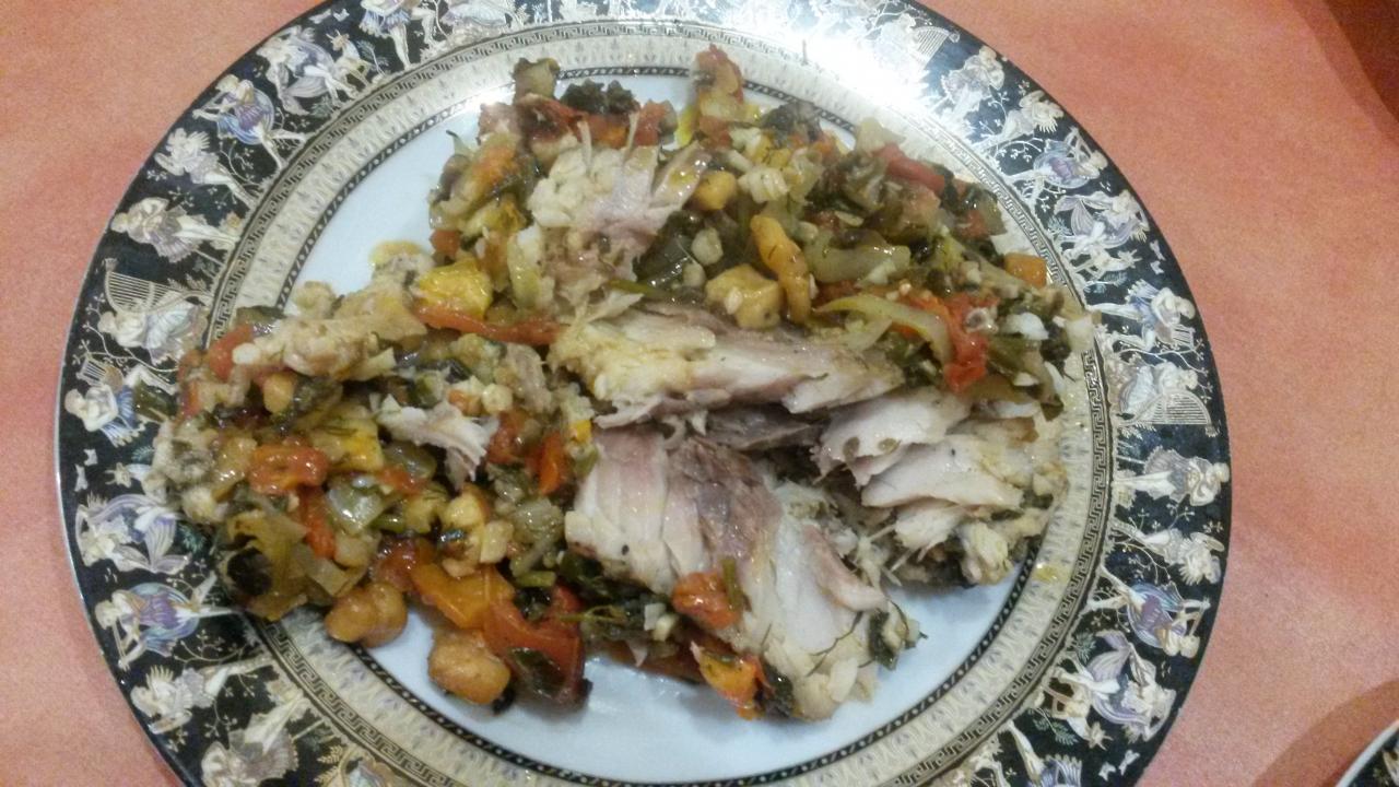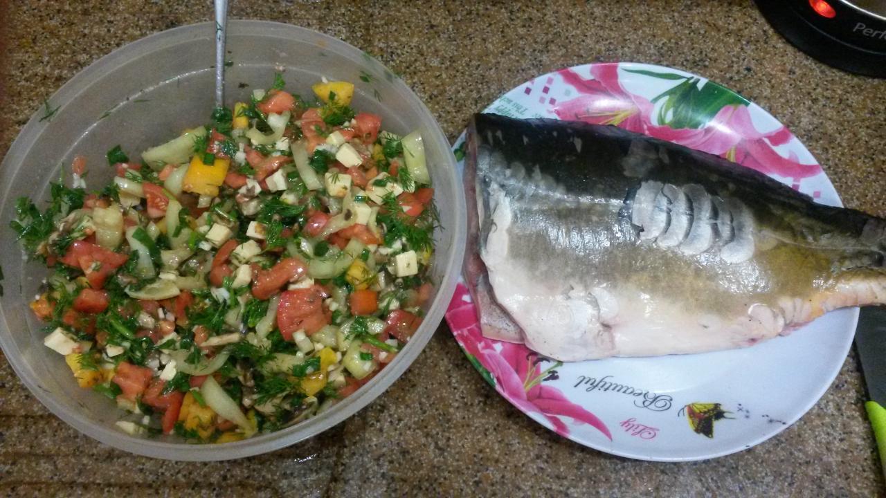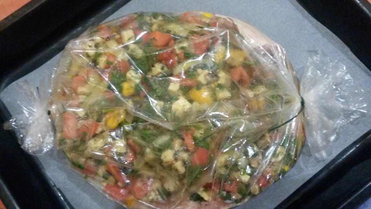 карп фаршированый овощами (грибы+перец+помидоры+чеснок+лимон+укроп+сыр+оливк овое масло)