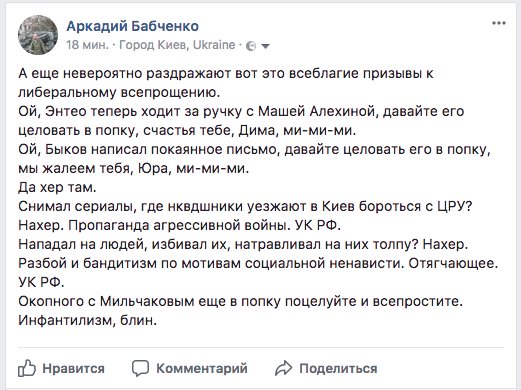 naletanet, может уже хватит раздражать окружающих? Всё-равно ты не поймёшь сути, тебе это просто не дано. Ясно же сказали, не нужно тут никого убеждать в любви и братстве. Россия ведёт войну против Украины и её народа на территории Украины, это неоспоримый факт. И ты хочешь, чтобы тут резко прониклись любовью к агрессору? Может тебе ссылку на портрет Адольфа дать? А чё, распечатаешь и повесишь. Да и похер что он напал, он не такой, добрый...