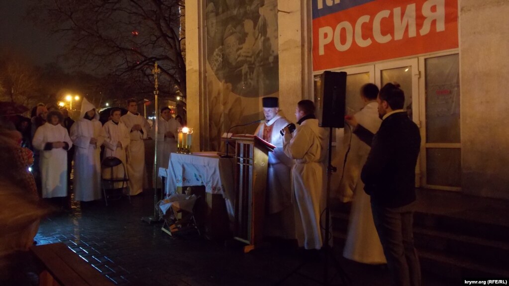 Католики Севастополя провели рождественскую службу под дождем у стен закрытого костела, который отобрали у них. Гонения на нерусских и неправославных продолжаются. Российский неофашизм рулит в крыму на полную.