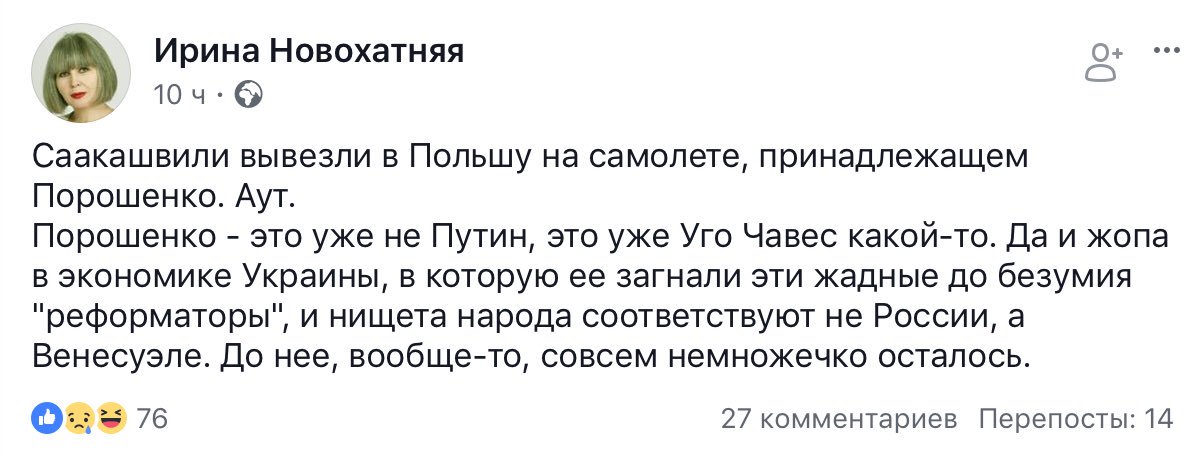 а вообще депортация меня удивила. Ещё раз подтвердив тайный сговор властьимущих. Его депортировали в Польшу, куда руки Грузии не сильно и дотянутся - Европа. А от нас они требовали выдать его, и Порошенко смалодушничал - просто предоставил возможность Саакашвили управлять - ливарюциями из Польши, не попав под сдачу его Грузинским властям.