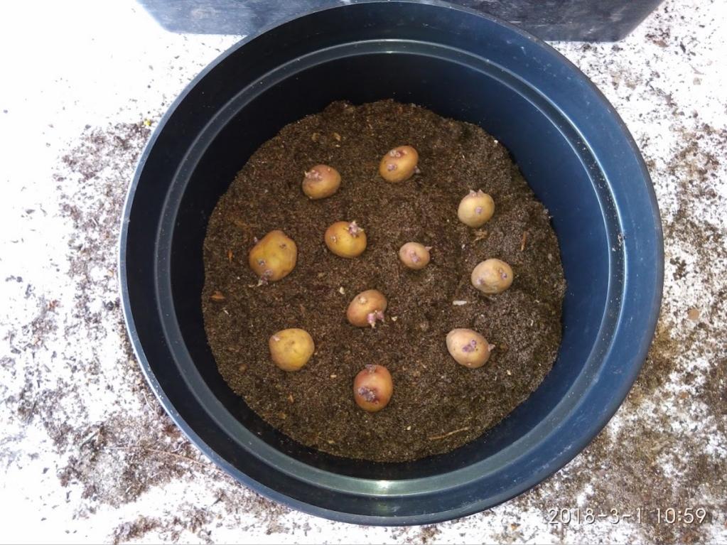 Берем емкость (в моем случае – это 20 л транспортировочный горшок) и заполняем его на 2/3 заранее приготовленной питательной грунтосмесью. Рассаживаем картофель согласно купленным билетам и присыпаем землей. Не забываем полить. Сорт «сорокодневка» - в апреле, надеюсь, получить сверхурожай)