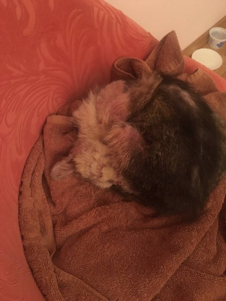 Лариса вначале покормила зверя, а рассмотрев ближе уже не смогла отказать ему в помощи. Кожные покровы кота - сплошная короста! У него постоянно течёт из глаз, с носа, гнойные выделения из мочеполовых путей, ушной клещ. Кот страшно обезвожен. У него нет половины зубов.