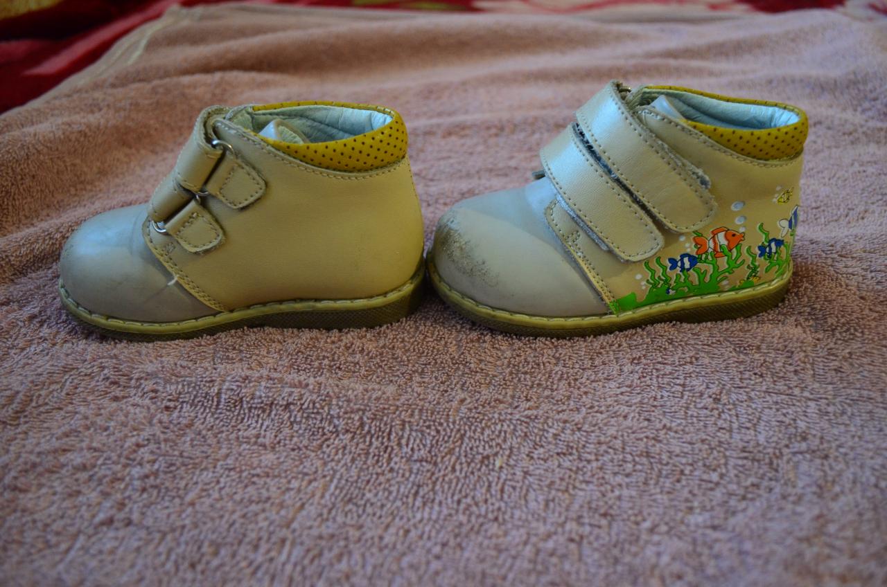 Кожаные, ортопедические ботинки подойдут и девочке и мальчику. Цвет - бежевый, с красивым рисунком, который не потерял свой вид. Немного сбиты носки, так как это практически первая обувь. По стельке 13,5см. Цена 150грн.