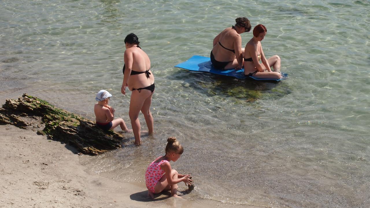 В Черноморке сегодня очень хорошая водичка- в меру чистая и прохладная(где то 22-23).Люди находятся в постоянной движухе - пришли-ушли,поэтому можно и позагорать.