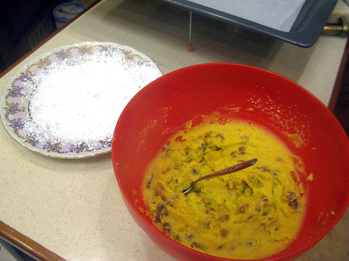 Вмешиваем частями минд.муку, смешанную с сахаром, в конце ликер, и изюм.