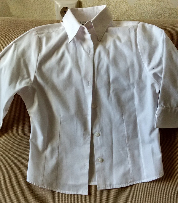 Рубашка белая с коротким рукавом, с погонами, 65% полиэстер, 35% хлопок, твердый воротник, объем ворота 36 см, в плечах 44 см, в груди 56 см, длина 80 см, новая, недостатков нет, цена 40 грн.