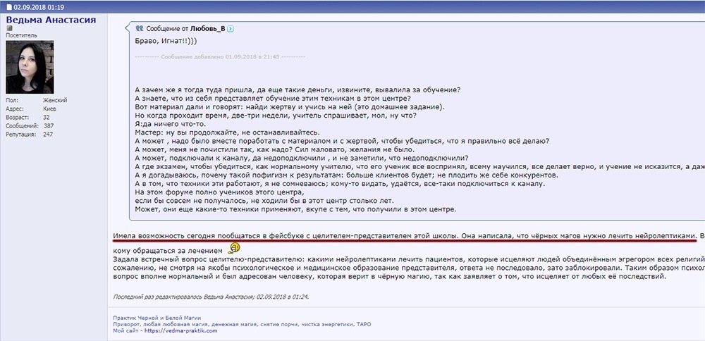 До этого Анастасия, вы лили грязь на известных регрессологов, таролога, которая уже кучу лет ведёт свою тему и позорились на других Украинских форумах, умудряясь поливать грязью людей, у которых куча отзывов, вылезя непонятно откуда в этом году, и не имея ни одного отзыва ни о своей работе, ни о работе вашего «мужа». Ваша глупая стратегия видна уже всем и абсолютно грязный самопиар и куча лжи. И да, я был в центре Путь к себе и знаю уровень их специалистов, которому вы так сильно завидуете. А вашу ложь я могу доказать просто элементарно двумя скринами. И про того, что сайта этого центра нет в гугле (вы видимо считаете людей за идиотов, и думаете, что никто не проверит?), и про то, что в центре лечат нейролептиками. Я не поленился и нашёл скриншот про то, где упоминались нейролептики в контексте наблюдения за чёрным магом (никто не писал, что черных магов НУЖНО лечить нейролептиками или про то, что ими кого-то лечат в этом центре). Но вы специально искажаете факты и несете ложь, опускаясь до вышеуказанного вами уровня необоснованной клеветы (вы с него к сожалению даже не поднимались ещё ни на одном форуме).
