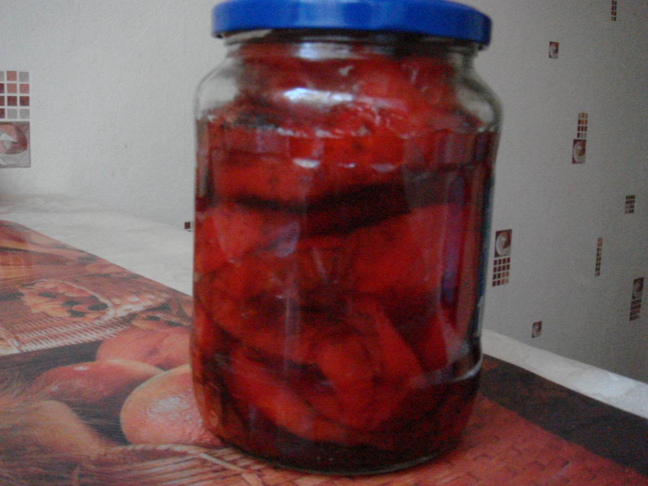 рецепт вро ди бі как нормальній, но вот технология.... четвертинки перца нужно бланшировать_ 2-3 минуті в кипятке, потом плотно складівать в банку, а затем заливать маринадом