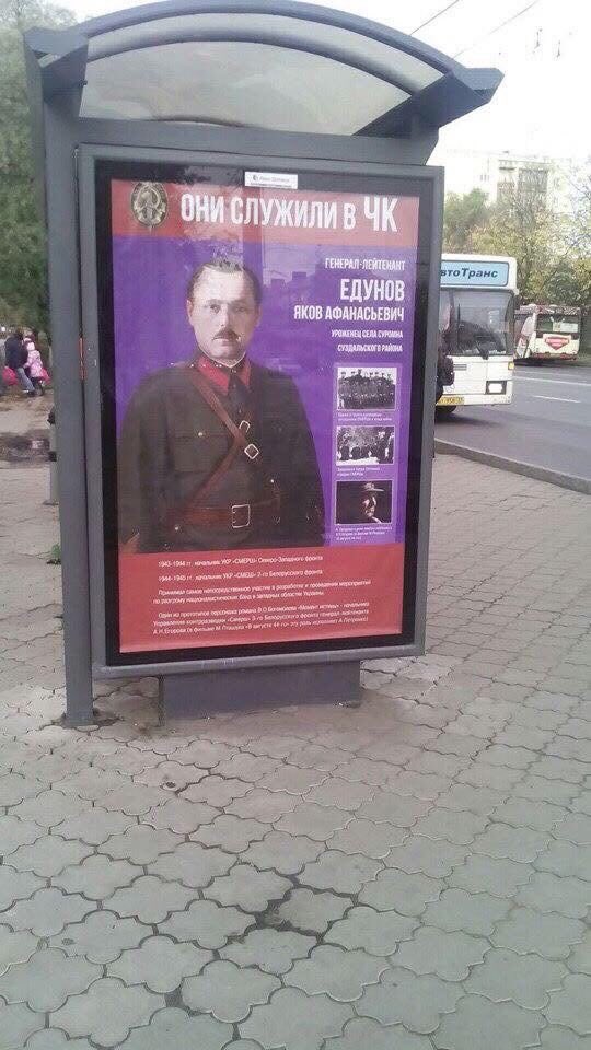 На остановках общественного транспорта во Владимире начали появляться информационные стенды о "героях"-чекистах. Дно пробито.