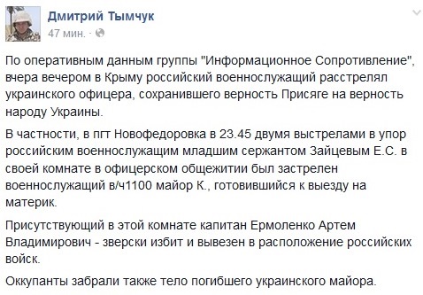 Всех студентов и сотрудников собрали на плацу, короткая речь и.о. ректора, ватники из числа местных студентов и сотрудников пенсионного возраста куражаться, и начали процедуру "прощания" с Украинским флагом. Играет гимн, и тут "не по плану" почти весь плац студентов начинает петь гимн (я скромно стоял в сторонке возле сотрудников и пел для себя), достают флаги Украины, раскрывают их, и орут во всё горло гимн, это просто было потрясающее зрелище. Ватники сотрудники и часть пророссийских (местных большей частью) студентов начинает паниковать, мол, всё пошло не плану. Музыка гимна заканчивается, но студы поют без музыки, а потом друг с другом устраиваюи перекличку "Слава Україні, Героям слава, Україна понад усе, Смерть ворогам", и.о. реткора в шоке кричит в микрофон что-то типа "музыка закончилась, хватит", но студы забивают на него и перекликаются дальше. И замолкают. Через секунду все вроде успокаиваются и начинает играть гимн России и подымают на зданием флаг РФ...