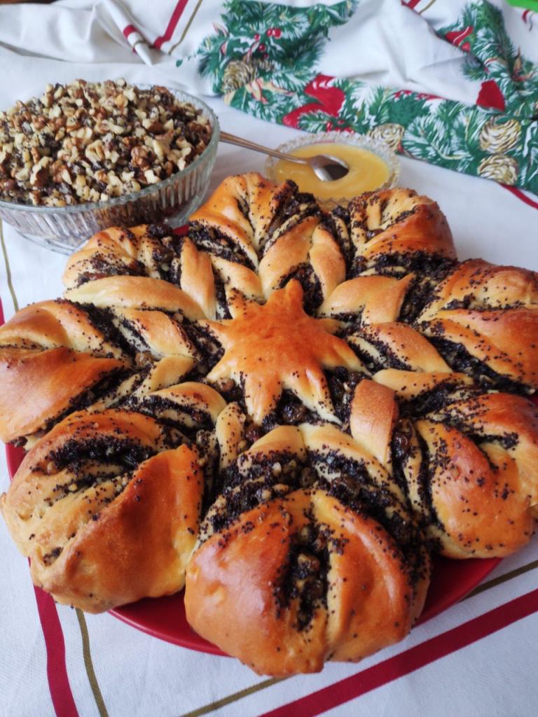 В этом году у меня не звезда, а комета вышла. Тесто по коломбической технологии. Что то я не так сделала... Было замечательное тесто в первом замесе, в холодильнике пёрло вплоть до формовки, потом при расстойке практически не было подъёма и нет воздушности. Наверное вернусь к Картинкиному.