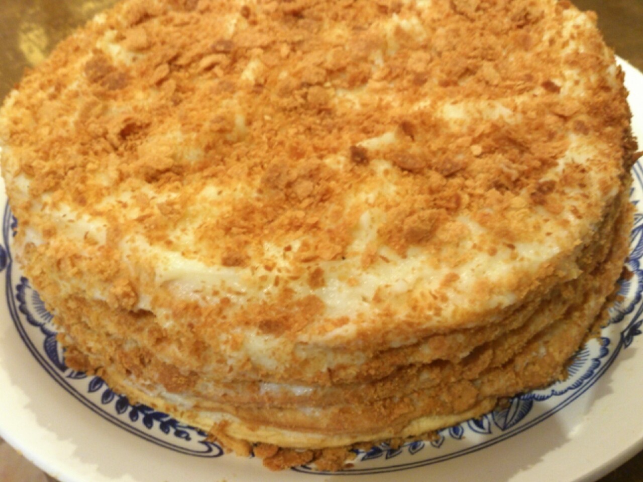Откопала свой древний рецепт,давненько наполеон не делала,все хотелось чего нибудь новомодного.Лет 20 точно.В следующий раз куплю натуральную ваниль,отщипнула кусочек,очень вкусно и ностальгия...(украшать не умею,в мое время его украшали именно так)