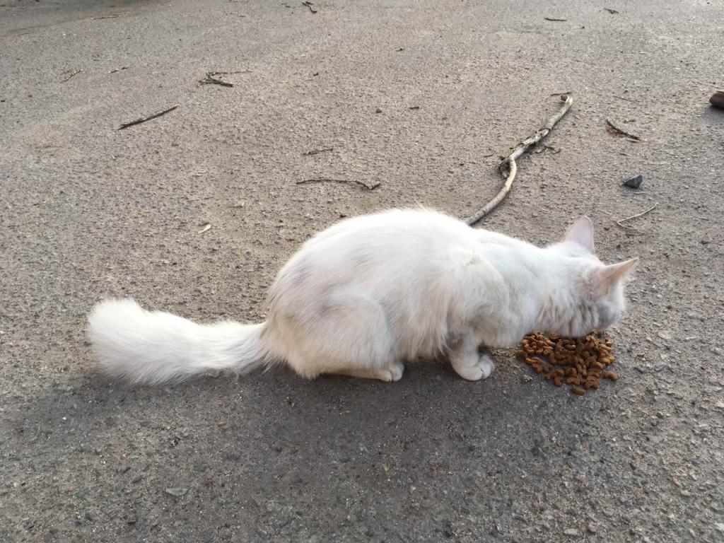 Видно было, что это домашняя молодая кошечка. На мой вопрос охранник ответил, что Кошка таки домашняя и это её хозяин иногда выпускает сюда погулять. Удивлению не было предела, потому что как раз было похолодание и такую, явно домашнюю красавицу, было бы естественней видеть где-нибудь в тёплой уютной квартире. Но она на улице, хоть у неё есть хозяин, который должен о ней заботиться. А по факту «должен» совсем не значит, что заботится. Маркиза по-прежнему живёт на стоянке, кушает, что бог пошлёт и охранники, худющая, шкурка посерела, но по-прежнему очень милая и ласковая. Молодая (до года), пушистохвостая, белоснежная (если отмыть) кошечка Маркиза.