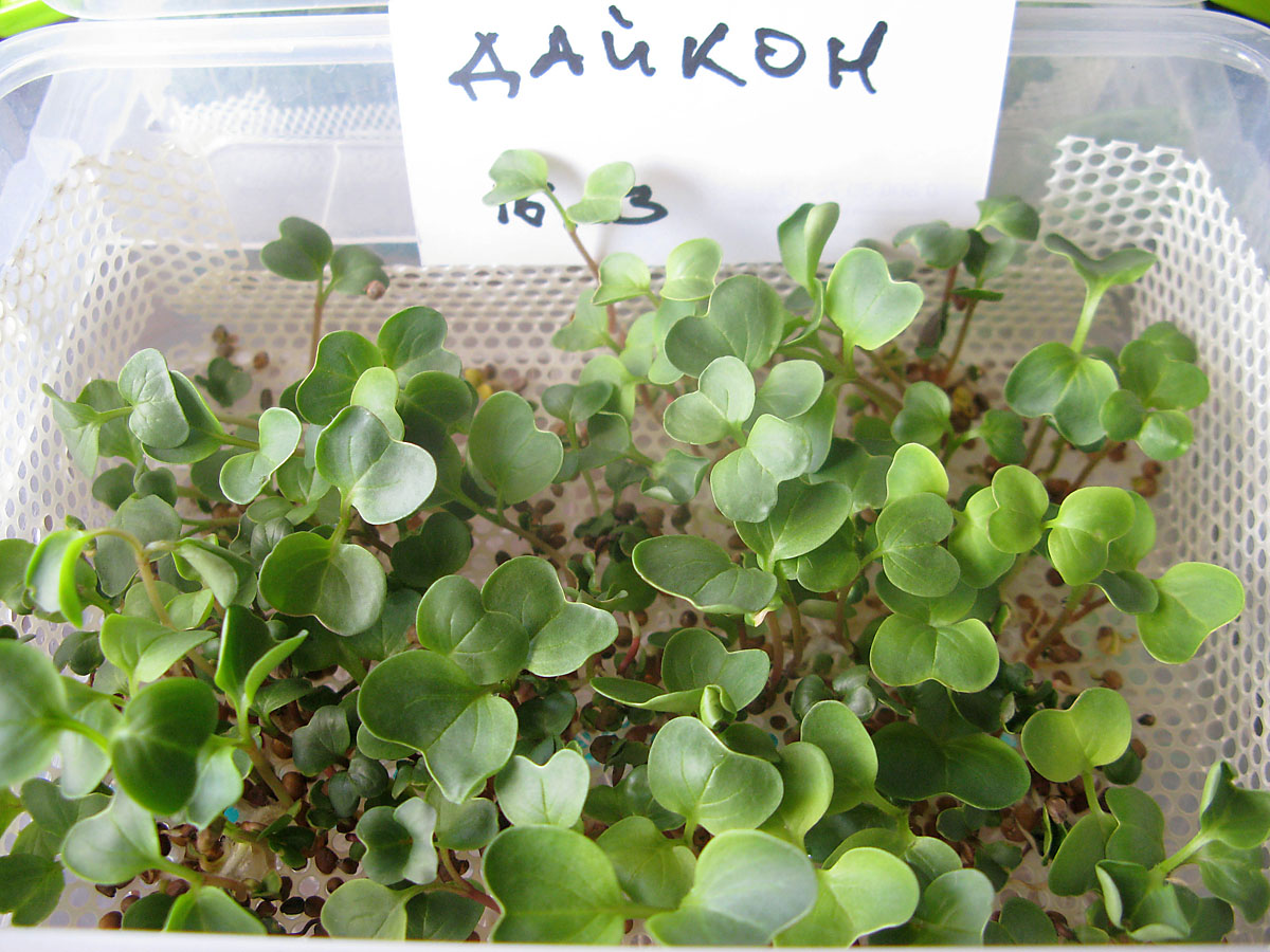 Дайкон я уже сажал неоднократно, с него начинал. Вот тут первый запуск.