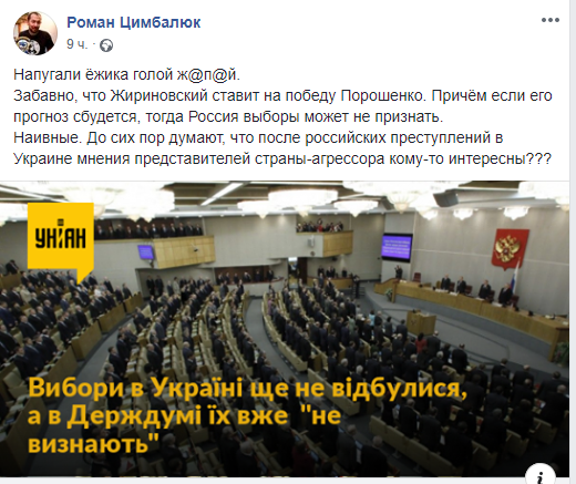Тим більше, що «не важливо, як проголосували, - важливо, як підрахували». Без сумніву, Порошенко, використовуючи свою владу, заздалегідь подбав про це. Він також прийняв закон про 2,5 мільйона гривень застави з кожного кандидата, який не дозволив нікому, крім еліти, брати участь у виборах. На жаль, в українському суспільстві гетьманів зараз більше, ніж козаків, і у порядних людей таких грошей на заставу немає. Тому масовка і складається, головним чином, з колишніх комуністів, які стали депутатами, і Зеленського, що, за прикладом Росії, виконує роль Жириновського.
