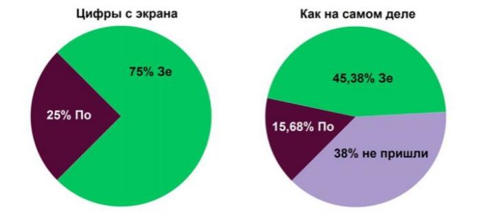 Доброй ночи, уважаемые сторонники Порошенко и сторонники Зеленского А некоторые даже адепты. В теме постоянно выкладывают цифры 72 и 25 процентов. Но и те и другие умалчивают в свою пользу, что это проценты не от числа всех избирателей, а от числа проголосовавших. Если же посмотреть реальную картину от всего числа избирателей, учитывая проигнорировавших выборы, то картинка достаточно сильно поменяется.: "По данным экзит-пола, 38% избирателей 21 апреля не ходили на избирательные участки. Таким образом, реально за Владимира Зеленского проголосовали 45,38% населения Украины. Даже так юморист уверенно побеждает, ведь его конкурент Петр Порошенко набрал только 15,68%." Если еще учесть испорченные бюллетени, то станет понятно, что один кандидат практически проигнорирован избирателем, а второй - вовсе не 3/4 от всех избирателей и никак не мессия, объединивший страну.