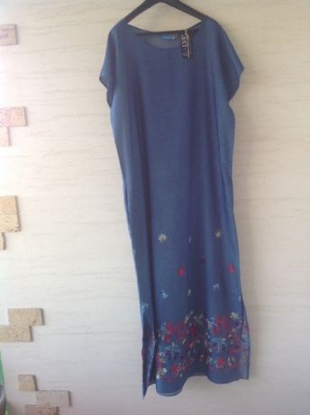 Хлопок 100%. Качество отличное! Ткань приятная, не жаркая. Платье не тяжелое. На Рост 170 без обуви до пола и даже чуть больше. Подойдет и на работу, и на прогулку, и на пляж.