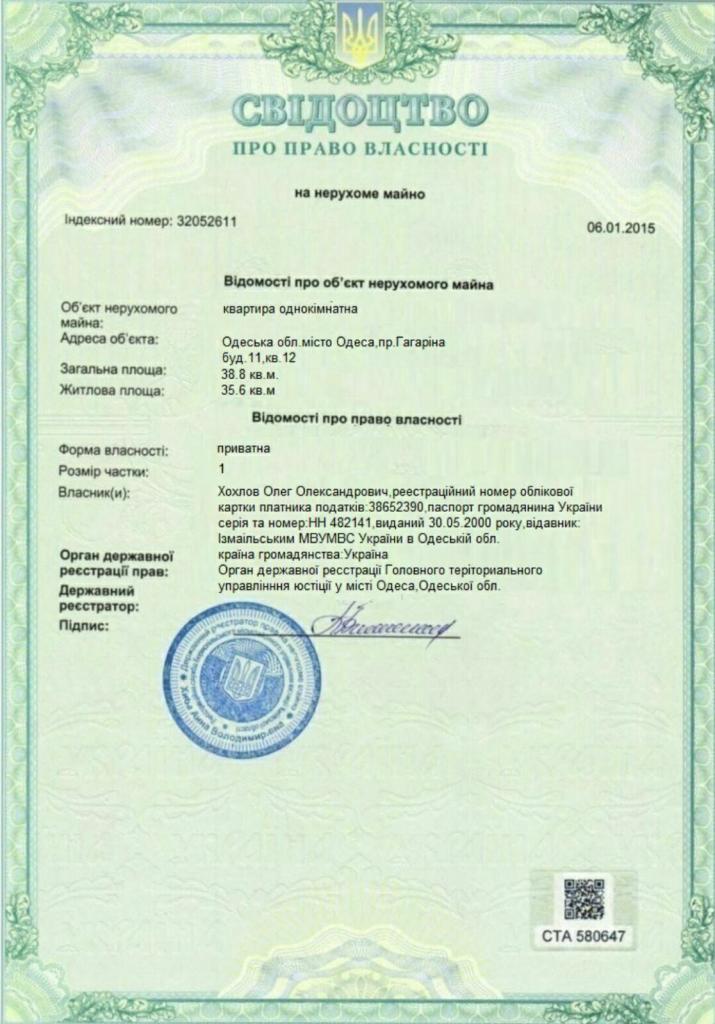 Арендодатель-мошеник. Размещает на OLX объявление о сдаче квартиры на Гагарина 11. Квартиру обещает показать только при заключении договора, так как находится в другом городе, а для гарантии брони просит выслать 1 тыс. грн, чтобы якобы убрать объявление с сайта и приехать для сдачи квартиры, для этого высылает паспорт на имя Хохлов Олег Александрович и липовые документы на квартиру (со временем нашла там массу ошибок). Договор заключает только через нотариуса, так как говорит, что военнослужащий. В день показа квартиры и заключения договора звонит заранее и говорит, что уже находится у нотариуса (кто-то из его друганов играет роль нотариуса, но при юридических вопросах не может нормально сформулировать ответ) и якобы для заключения договора необходимо видить факт оплаты, начинают подгонять и давить. После этого, подозреваю, что пропадают.