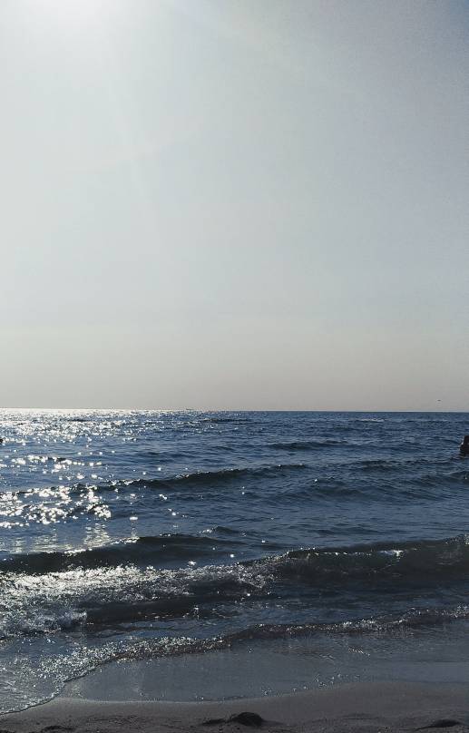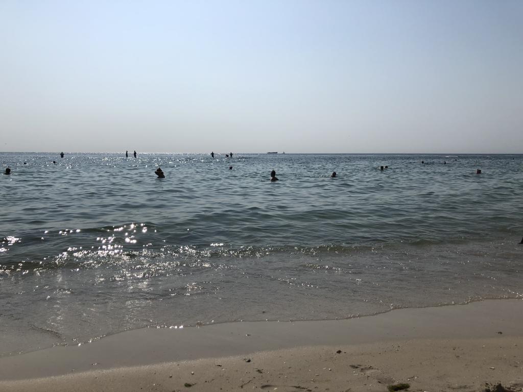 Сегодня в 9.30 уже толпа на пляже Пограничников. Вода тёплая, местами водоросли на дне.