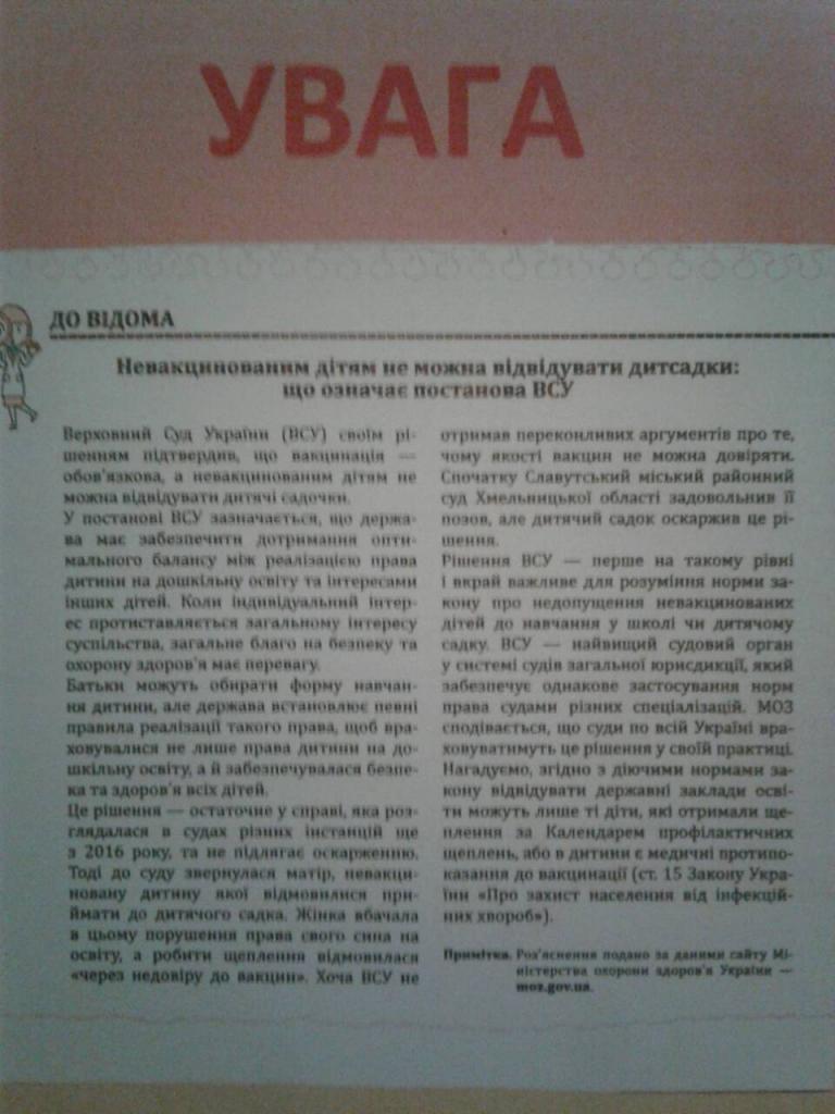 Этот кейс тут не раз разбирали. Основное: решение по конкретному ребёнку, в конкретной ситуации. То, о чём в агитке не упомянули: в их ситуации был статус неблагоприятной эпидемиологической обстановки, и садит смог это доказать, а тогда работает закон "Про захист населення від інфекційних хвороб". Для адекватных людей, и без суда было бы понятно. В обычном режиме (ситуации) - все должны допускаться.
