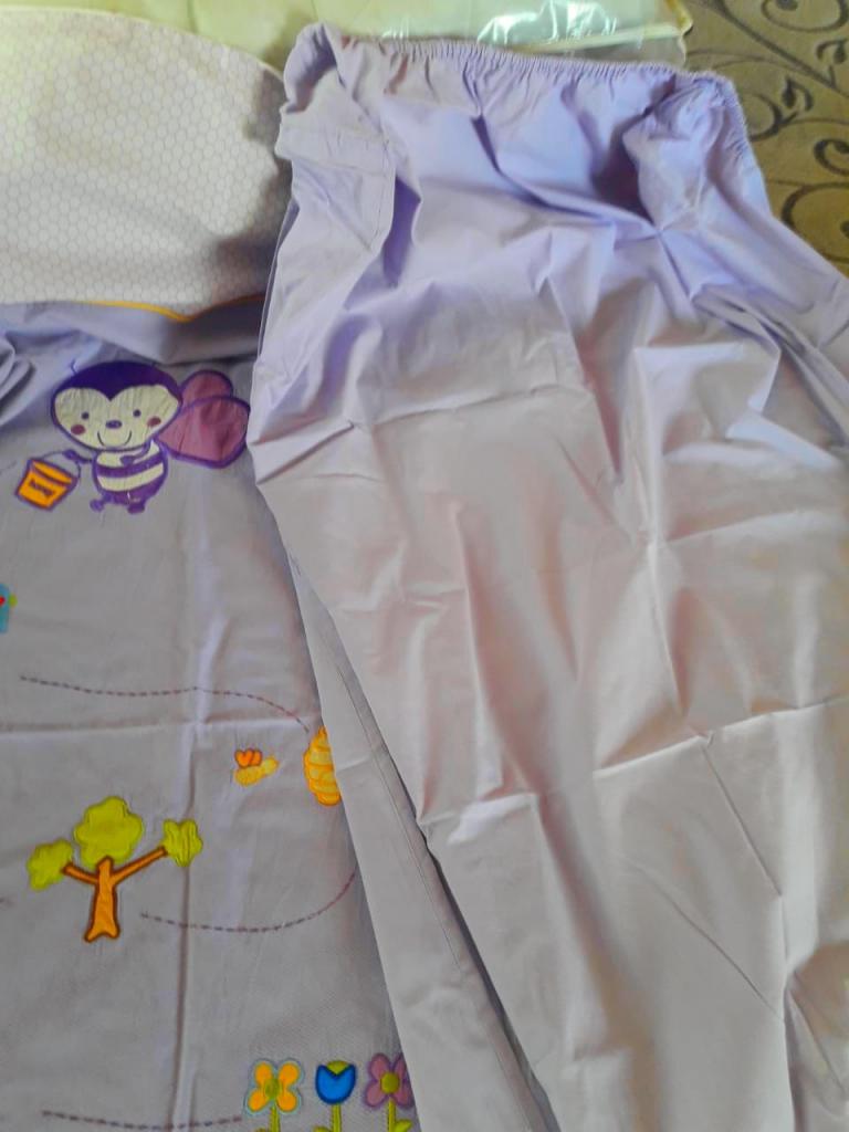 Детское постельное бельё Feretti нежно-фиолетового цвета, подойдёт как для девочки, так и для мальчика. В комплект входит бортики, пододеяльник, простынь на резинке, наволочка, подушка, одеяло. . Пятен и других деффектов нет.