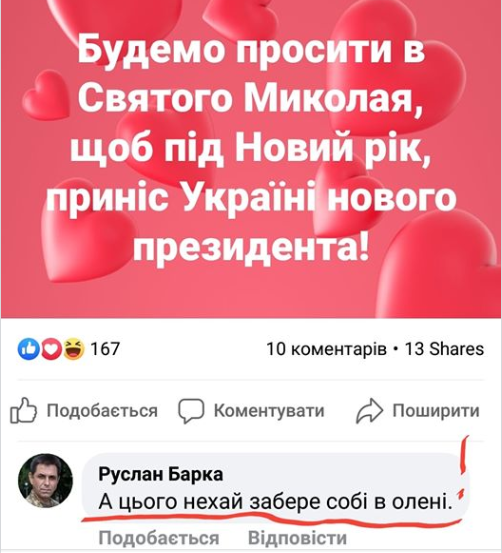 “Ми про цю особистість нічого не знаємо, крім того, що він абсолютно непридатний до професійного виконання функцій президента нашої країни. Це очевидно! У нього ні освіти, ні підготовки, ні компетентності, ні, нарешті, відчуття своєї приналежності до цієї країни. Це не його країна! Він тут на гастролях. Він – московський шоубізнесмен, виплеканий московським бізнесом. Він не знає цієї країни, він її не відчуває. Це все – величезне шоу! Ми – всередині цього реалітішоу, з якого не можемо вийти”.