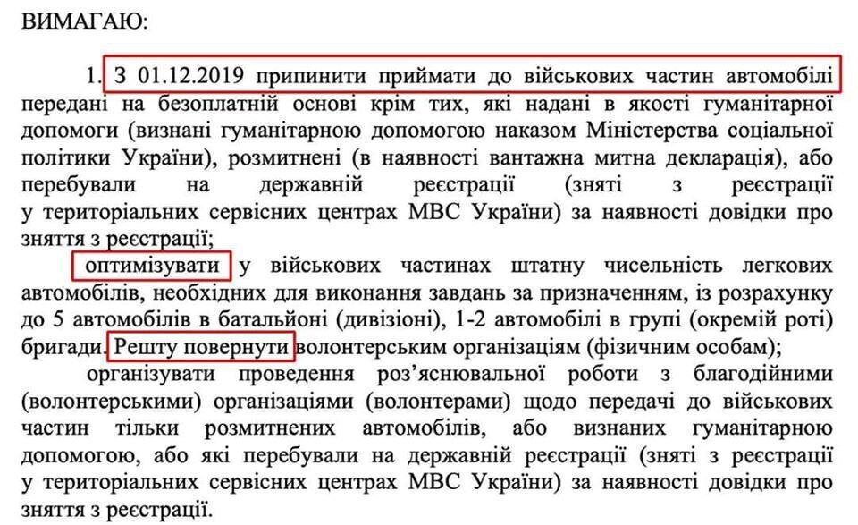 Перший заступник командувача Об'єднаних сил генерал-майор Ігор Танцюра зажадав, щоб воїни ЗСУ повернули назад волонтерам машини, які ті передали на потреби армії.