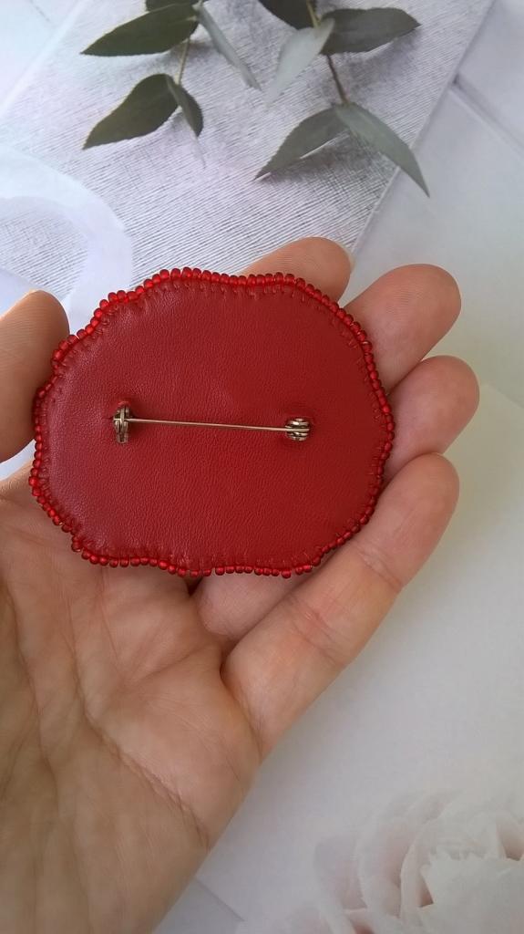 Яркая рубиново-красная брошь с черными акцентами, расшитая хрустальными бусинами, керамическим жемчугом и стразами, обратная сторона кожаная, американская булавка-застежка. В наличии, 350грн