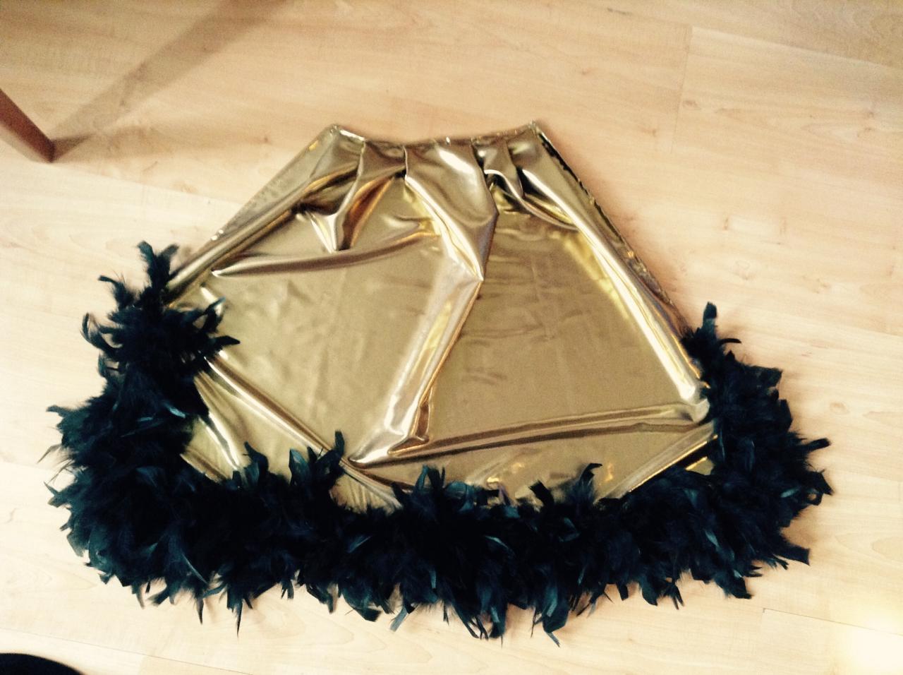 Состав костюма: блузка с жабо, жилет, накидка с перьями, золотой пояс, шорты или штаны, чешки, корона