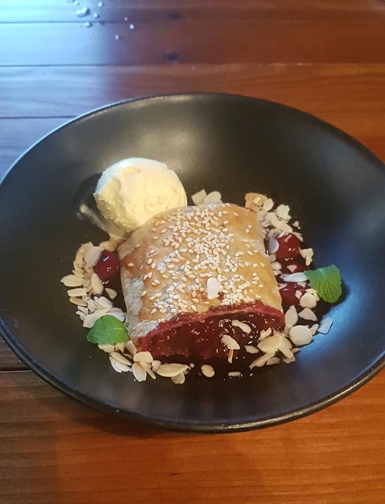 Цезарь, салат с ростбифом, марокканский чай и вишневый штрудель - 500 грн плюс чаевые.