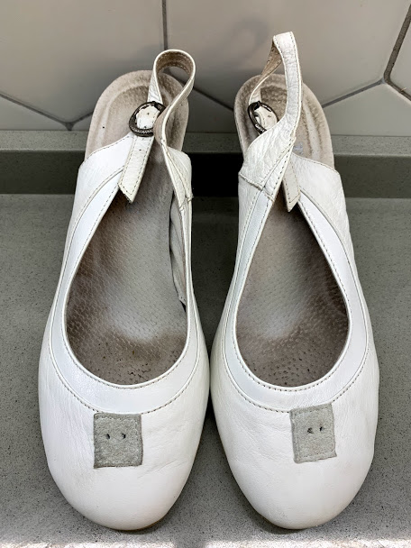 Полностью кожаные туфельки белоснежного цвета. Очень, очень удобная колодка, невысокий каблук (брала с собой балетки, но так и не пригодились), целый день в них ходила и танцевала.