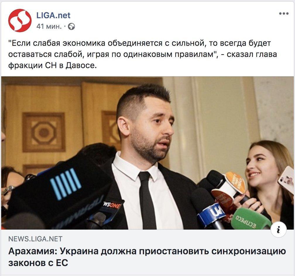 Арахамія заявив, що Україні слід відмовитися від політики гармонізації власного законодавства із ЄС, бо це економічно невигідно.