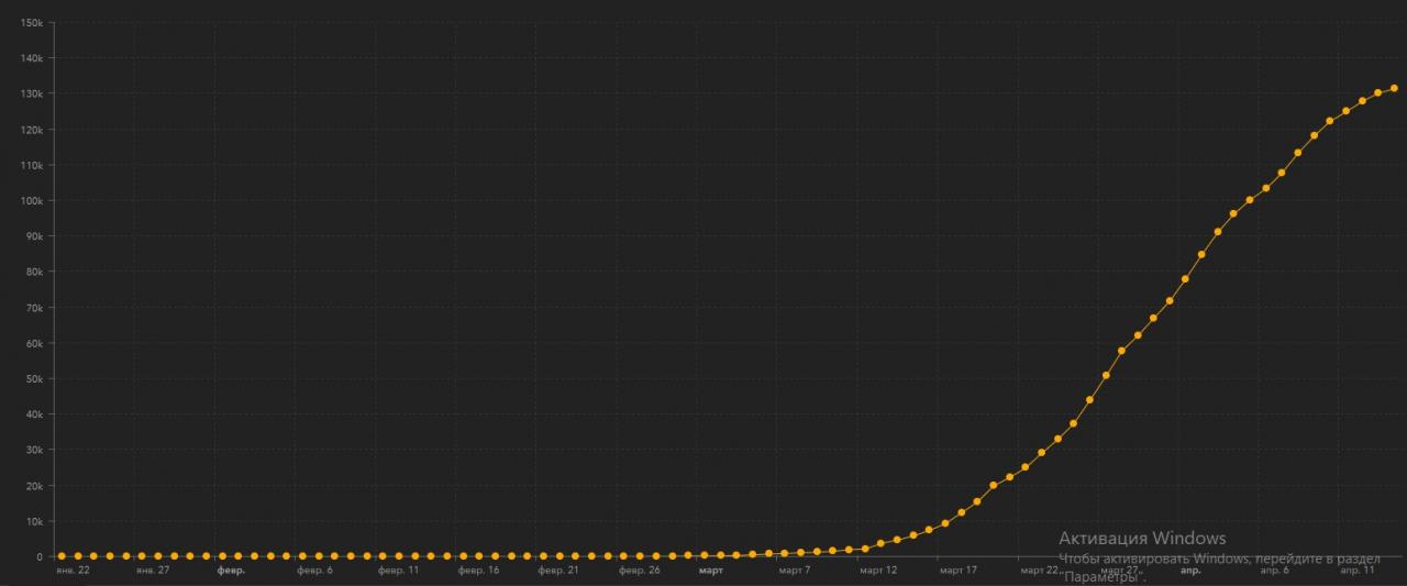 Количество инфицированных суммарное, конечно же, растет, а количество инфицированных по дням с 10-го апреля уменьшается, при этом количество выздоровевших + умерших превышает количество инфицированных, по дням - последние дни, а не за весь период, общее количество активных случаев постепенно уменьшается. Всего заражений 132210, активных случаев на сегодняшний день 56115 (42,5%).