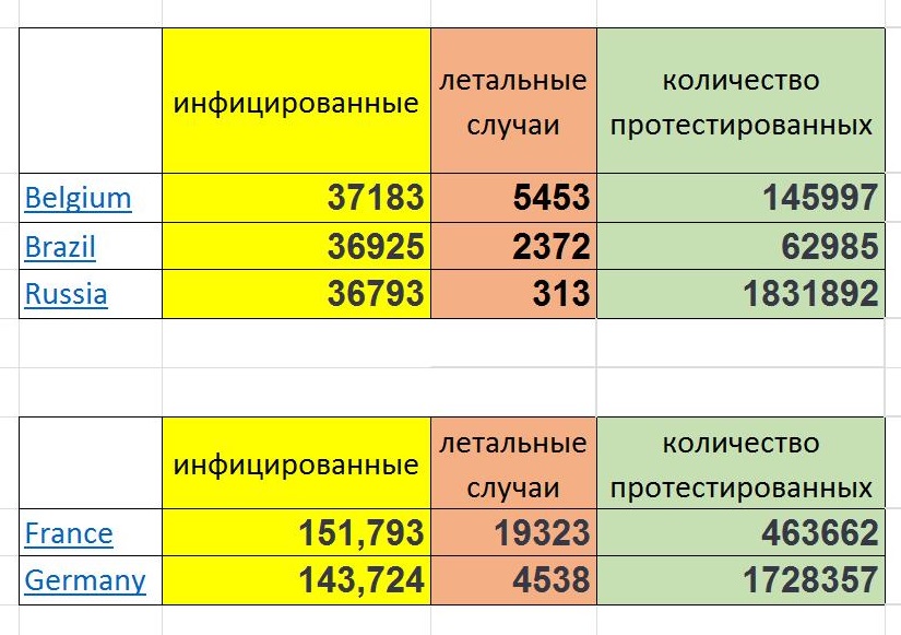 В каких в этих? Ты зачем росию в таблицу с приличными странами втулил? Бразилию и Бельгию перенеси в нижнюю таблицу а к росии добавь Северную Корею и Белорусь - и тогда уже твое - "в этих странах лечат по разному" будет иметь хоть какой то смысл.