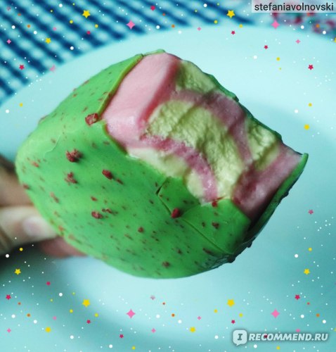 " Сочетание лимонного мороженого и земляничного сорбета в форме эскимо. Но это далеко не все! Потому что еще есть кактус: шок-глазурь зеленого цвета со вкусом кактуса и с добавлением кусочков ароматной малины!"