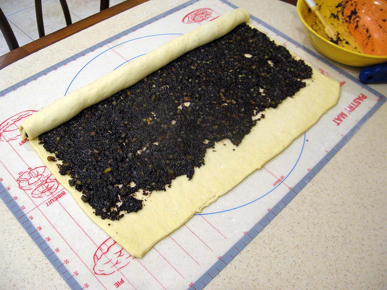 тесто липковатое, сворачивать рулет можно только скребком, тесто прилипает к столу.