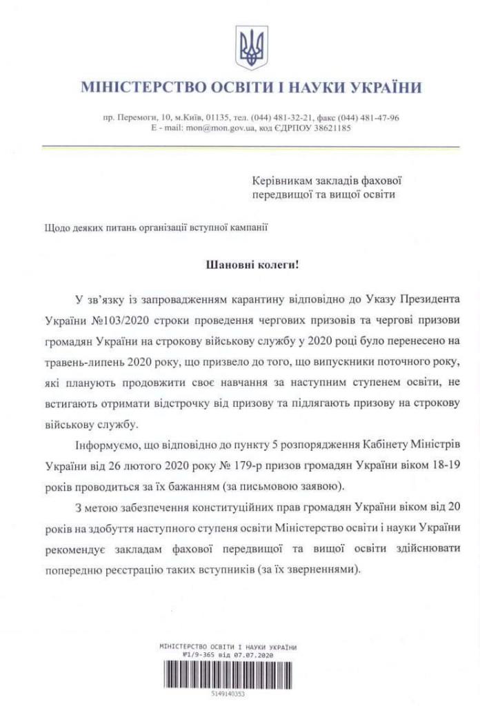 рекомендувати головам обласних та Київської міської призовних комісій, за поданням районних (міських) призовних комісій, надавати (за письмовими заявами призовників) відстрочки від призову за частиною п’ятнадцятою статті 17 Закону України «Про військовий обов’язок і військову службу» до 01.10.2020 року громадянам України: